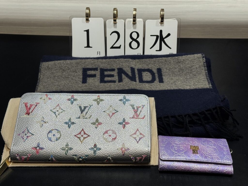 LOUIS VUITTON ルイ・ヴィトン モノグラム・フローラル ジッピー・ウォレット シルバー FENDI フェンディ マフラー ウール ネイビー/グレー ANNA SUI アナスイ キーケース パープル 買取