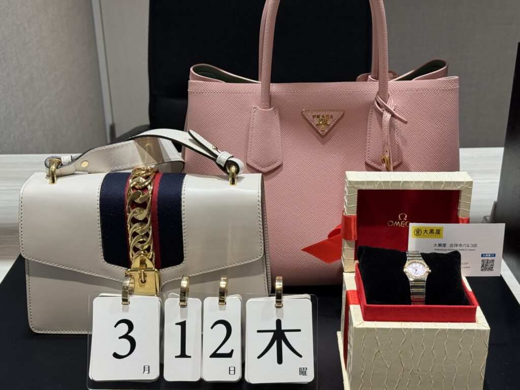 PRADA プラダ ドゥーブレ ミディアムバッグ ライトピンク サフィアーノ GUCCI グッチ シルヴィ 2WAYバッグ ホワイト レザー OMEGA オメガ コンステレーション マイチョイス シェル YG/SS クオーツ 買取