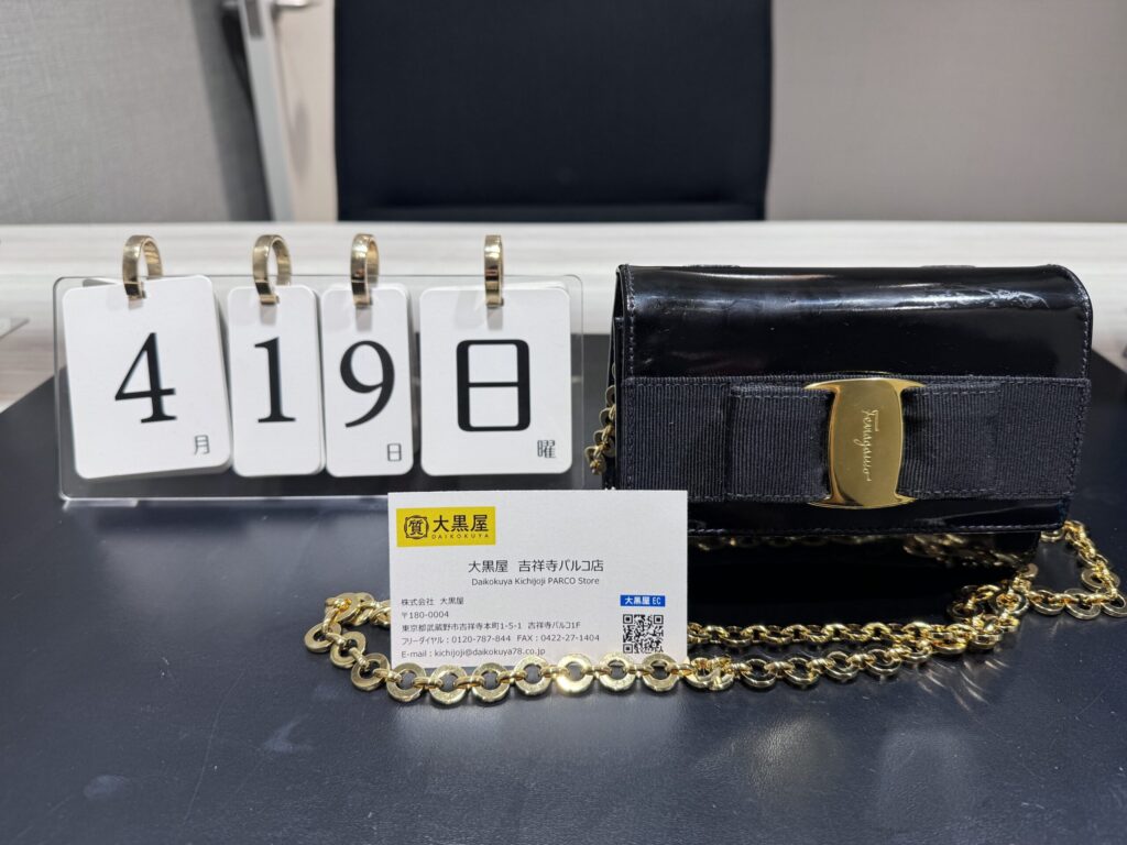 Salvatore Ferragamo サルヴァトーレ フェラガモ ヴァラ チェーンショルダーバッグ ブラック ゴールド金具 エナメル 買取